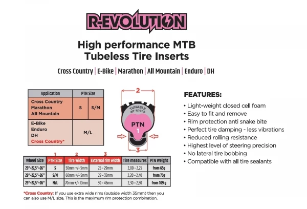 R-Evolution, la révolution de l’évolution ! Le R-Evolution de Pepi’s Tire Noodle est un insert révolutionnaire développé avec l’aide des meilleurs vététistes du monde. Une structure légère et unique de ce type, optimise le fonctionnement des configurations tubeless, augmente la précision de pilotage, protège les jantes et permet même de rouler à plat. Consultez le tableau des mesures pour vérifier quelle taille correspond à vos besoins.