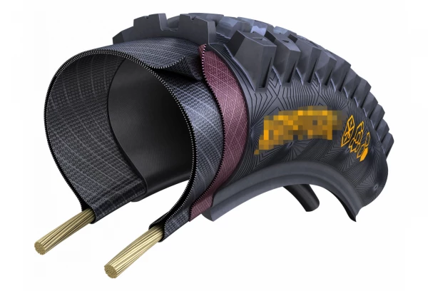 La construction Trail Casing est constituée de trois couches de matériau de carcasse, sous la bande de roulement, pour la robustesse et la protection contre les perforations. Sur les flancs, deux couches de matériau de carcasse apportent souplesse et adaptabilité, tandis qu’une couche de tissu croisé évite les coupures et les entailles.