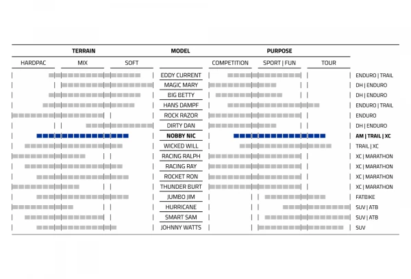 Le Nobby Nic est le pneu VTT de chez Schwalbe avec la plus large palette d’applications. La polyvalence en toutes situations, peu importe la météo ou le terrain. Il offre le champ d’utilisation le plus large possible : du XC aux pistes d’Enduro techniquement difficiles en passant par la rando et le All Montain.