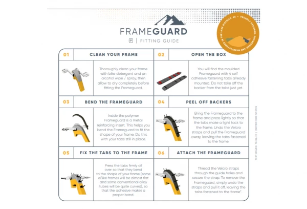 Il se compose de deux parties. Il y a 4 languettes métalliques flexibles et adhésives qui se forment et se collent à votre cadre et au boîtier du moteur. Elles fournissent l’ancrage pour votre Frameguard sans modifier ou endommager votre vélo de quelque façon que ce soit.